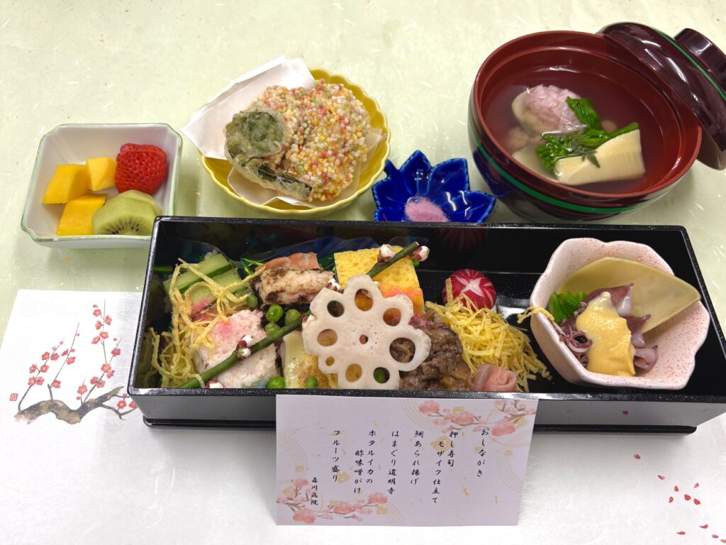 当院でも、皆様にひな祭りのお料理を楽しんで頂きたく、「ひな祭り 行事食」をご準備致しました。見た目からも楽しんで頂けるように工夫を凝らし、春の訪れを感じることができる旬の食材を用い、一つ一つシェフがこだわって丁寧に仕上げました。
