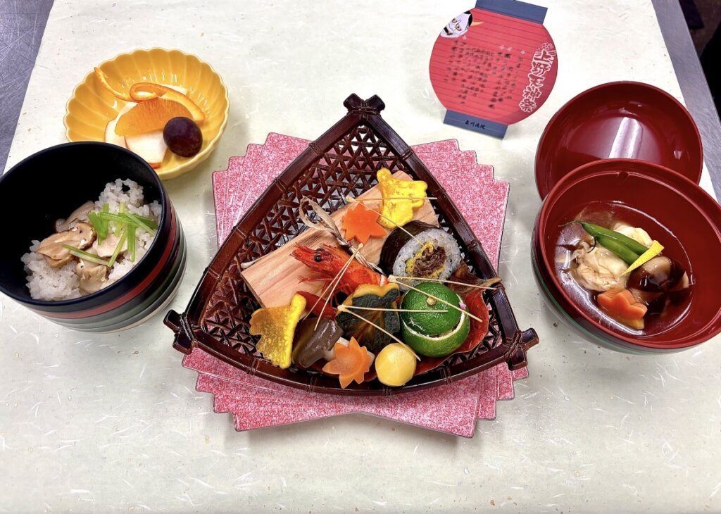 伊賀市では、10月17日(金)~10月19日(日)まで上野天神祭が開催されています。 本日は「上野天神祭 行事食」をご提供致しました。秋の訪れを感じていただけるよう、旬の食材をふんだんに用いシェフが細部にまでこだわり、一つ一つ心を込めて仕上げました。