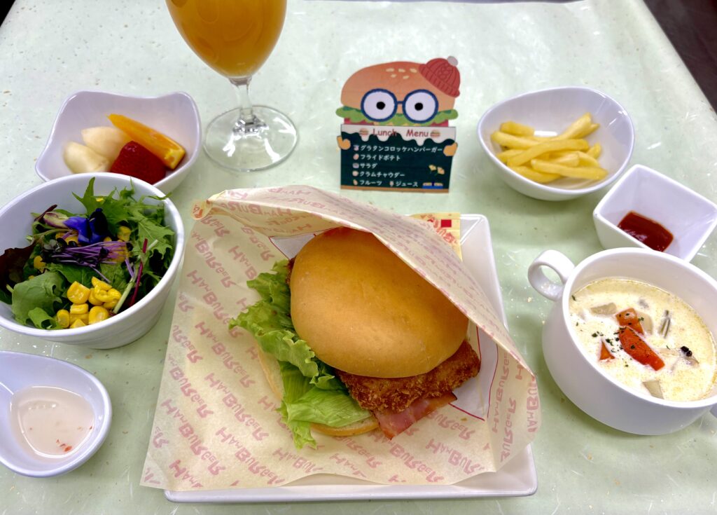 美しく風に舞う木の葉に秋の深まりを感じる季節になりました。本日はハンバーガーランチを冬仕様に、『グラタンコロッケハンバーガー』をご提供いたしました。シェフが心温まるよう、こだわって仕上げたボリューム満点の一品となっております。