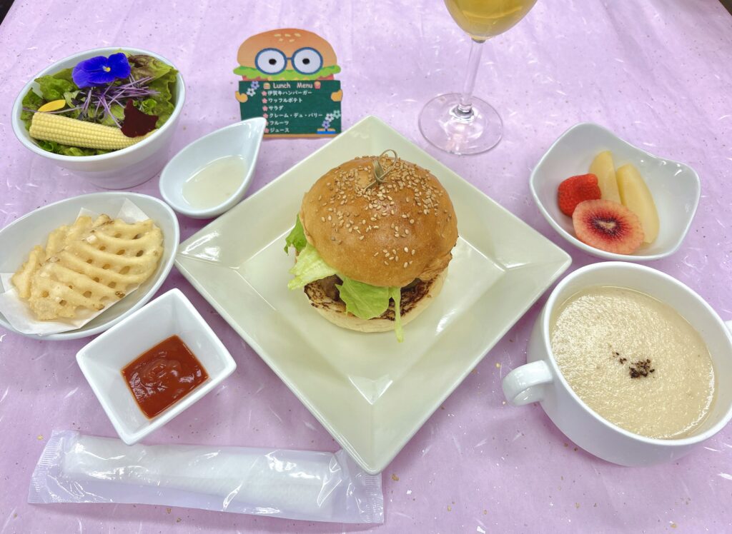 春のうららかな日差しが、顔をのぞかせた若草にも降りそそいでいます。本日は、皆様に大好評をいただいております『伊賀牛ハンバーガーランチ』を行いました。ハンバーガーの中には、伊賀牛を使用したハンバーグだけではなく、チーズやアボカド、ベーコンのなどの中身がたくさん入っており、ボリューム満点な一品となっております🍔